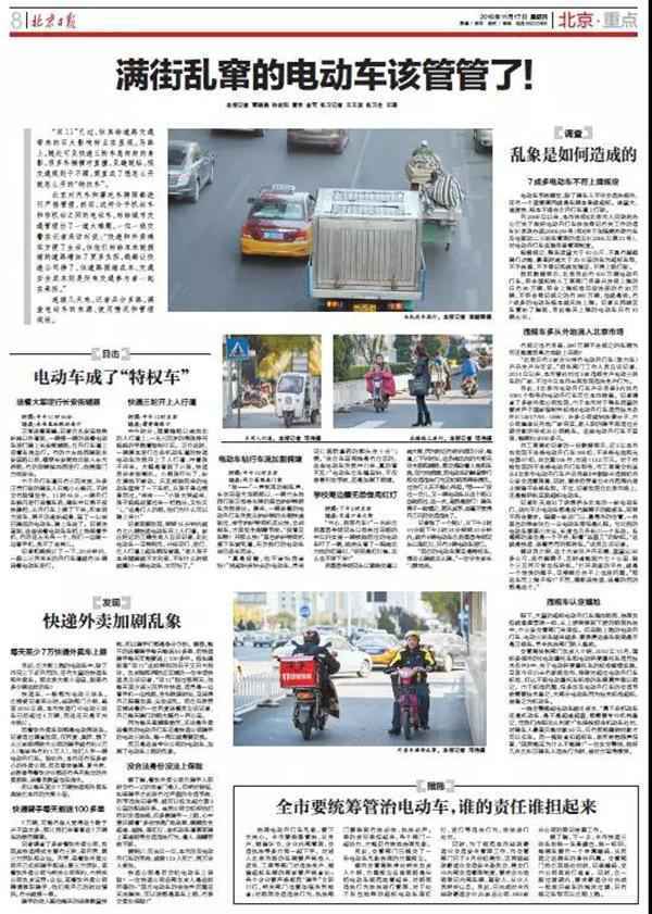 本报长期关注电动车乱象,图为2016年11月17日整版报道,提出了7成多电动车不合规、大多数从外地进京、认定难、处罚难等问题。