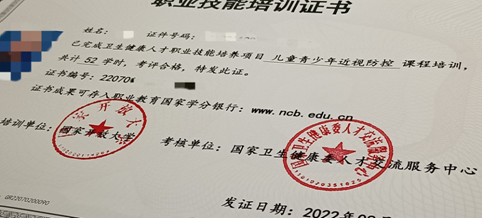 由国家开放大学提供线上理论培训,由黄山东理职业培训学校(东理视光学院)进行实操培训。最终经国家卫健委人才交流中心组织评价,考核合格,颁发证书。